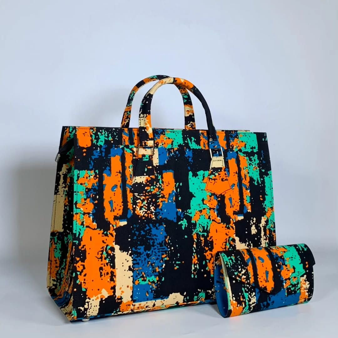 Make a statement wherever you go with the Vivid Mosaic Tote Set, a perfect fusion of art and fashion. Crafted with high-quality Ankara fabric in a stunning mix of orange, teal, navy, and cream tones, this set captures attention with its abstract, paint-splash design — ideal for the modern woman who loves to express individuality through style.